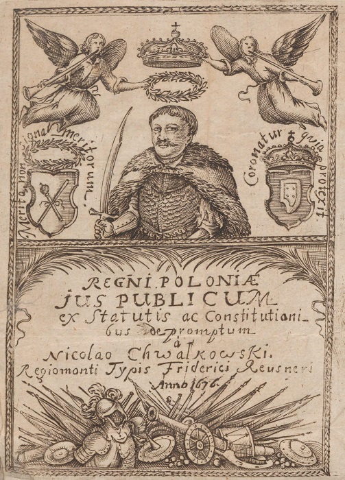 Jan III Sobieski – grafika na karcie tytułowej dzieła Mikołaja Chwałkowskiego Regni Poloniae Ius Publicum ex statutis ac constitutionibus depromptum, wydanego u Fryderyka Reusnera w Królewcu w 1676 r., a więc w roku koronacji Sobieskiego. Źródło Polona
