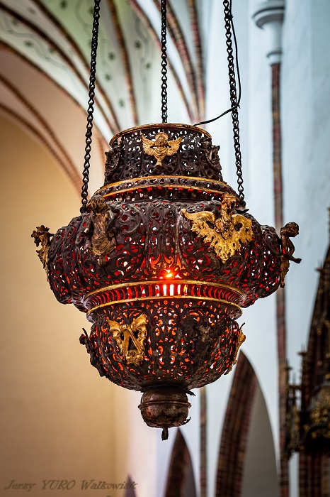 W 1668 r. król Jan Kazimierz ofiarował tę lampę do kościoła kolegiackiego, wśród innych darów znalazły się „złocista sukienka” [na obraz], kapy, ornaty i lichtarze. Przekazanie darów królewskich opisał ks. Jan Walenty Wiroboski . Zdjęcie Jerzy Walkowiak