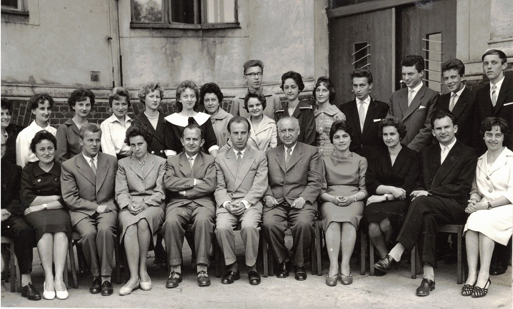 Maria Straszewska z domu Przybylska (siedzi 3. z prawej) z nauczycielami i uczniami Gimnazjum i Liceum im. ks. Piotra Skargi – klasa maturalna z 1960 r.
